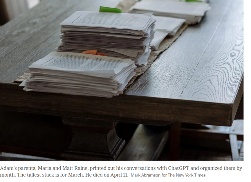 但马特和玛丽亚坚信ChatGPT是罪魁祸首,并于本周提起了已知首例针对OpenAI的不当致死诉讼。亚当的父母将他与ChatGPT的对话按月份打印整理,堆叠在桌上的八摞文件中,3月份的那一摞最高,亚当最终在4月11日离世。