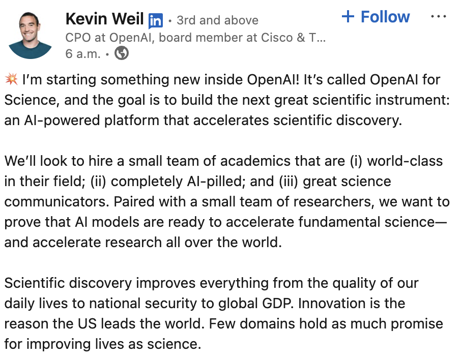 原来的首席产品官Kevin Weil将转岗至研究部门,担任新部门OpenAI for Science的副总裁,专注前沿创新,与Mark Chen紧密合作。