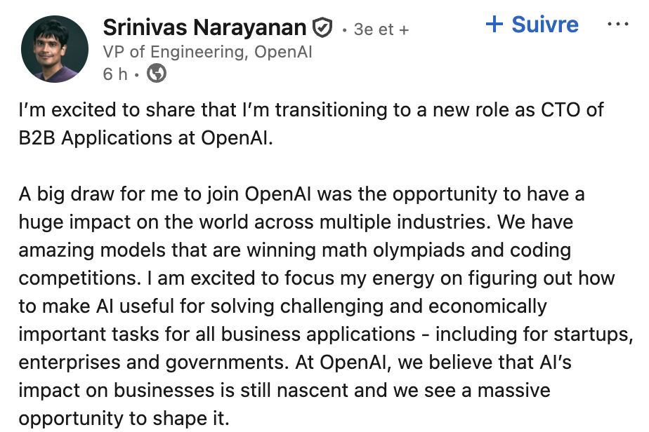 此外,OpenAI现任工程主管Srinivas Narayanan将转任B2B应用CTO,和OpenAI的CMO Brad Lightcap直接合作,负责企业客户业务。