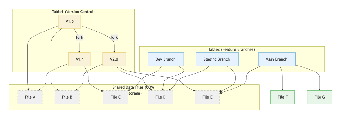 -- 表 `db1.table1` 数据量 100GBCREATE TABLE `db1.table2` BRANCH `branch1` FROM TABLE `db1.table1` {SNAPSHOT = 'V2'};-- 表 `db1.table2` 数据量 100GB,但实际存储量只有 10GB,因为共享了 `db1.table1` 的 10GB 数据。-- BRANCH 底层依赖 `CLONE` 能力。对比 `CLONE`,多了 `BRANCH` 的操作管理,为分支管理提供支持。