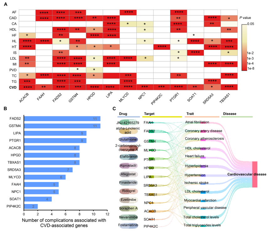 评估靶基因与CVD多种并发症的关联广度,29个基因均关联3–5种CVD并发症;FADS2、HSD17B12、GSTM4等贡献最显著