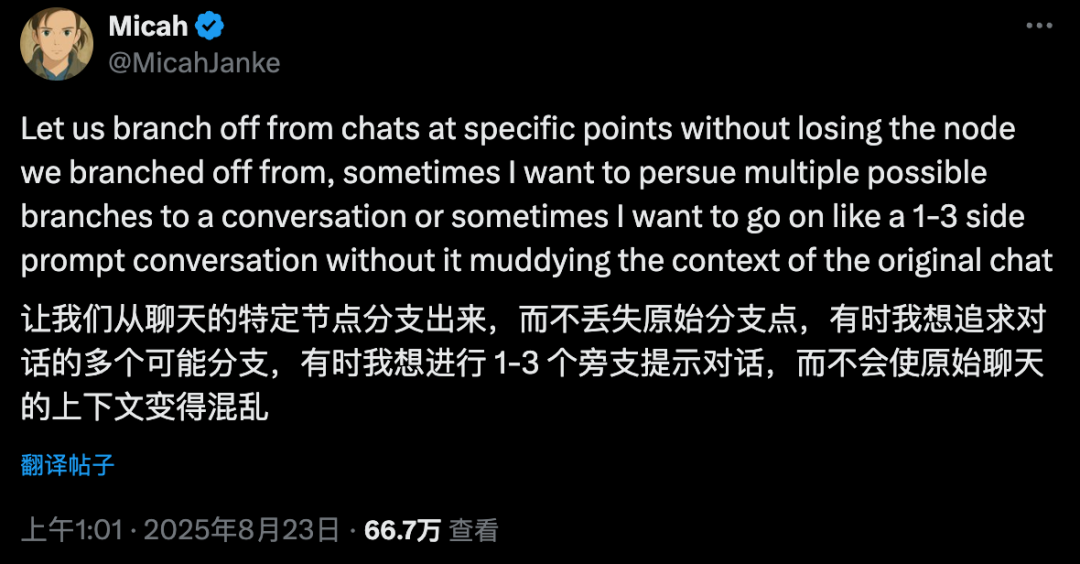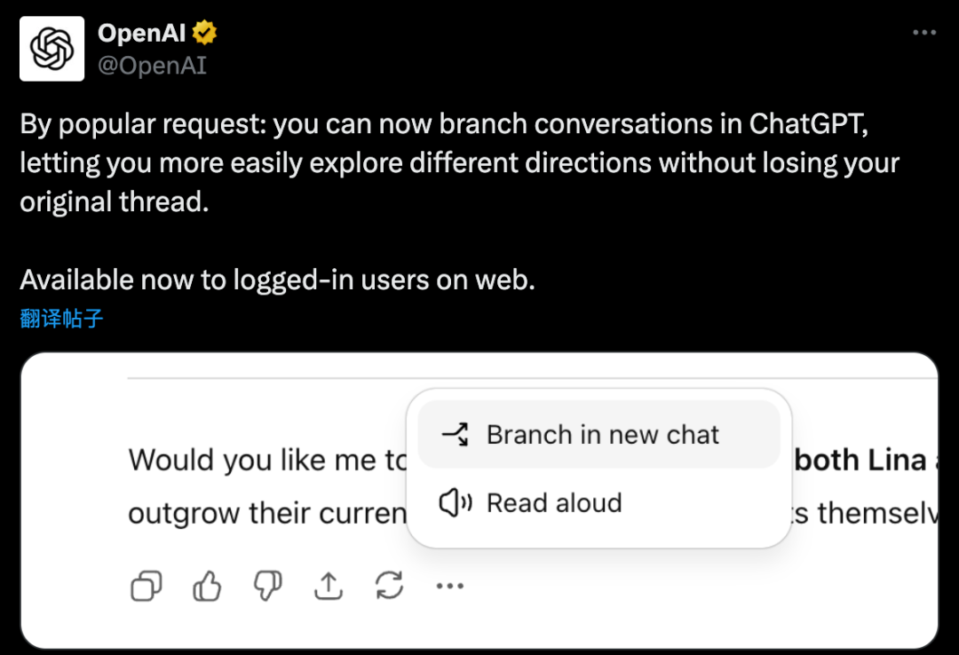 这是因为此前有不少网友给OpenAI反馈,称“有时候我想进行1-3个分支对话,而不会让原始对话变得混乱”。