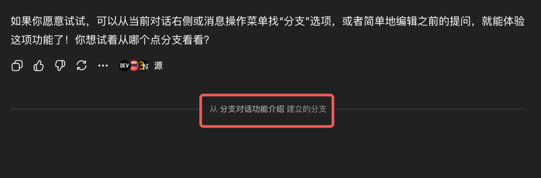 在我们点击“分支对话”之后,对话框会在底部自动分割出来一条线,并标明是“从[某某话题]建立的分支”: