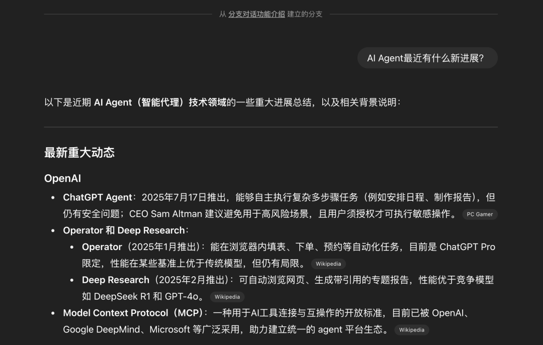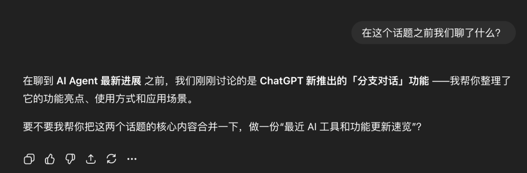 可以看到,ChatGPT清晰地记得之前“分支功能”的话题,并询问是否需要将这两个话题的核心内容做合并。