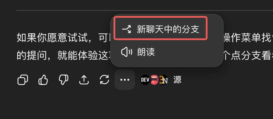 而这个功能的作用也是如其名,现在只需要点击“分支对话”的按钮,就可以在原有对话的基础上“岔个话题”聊天了。