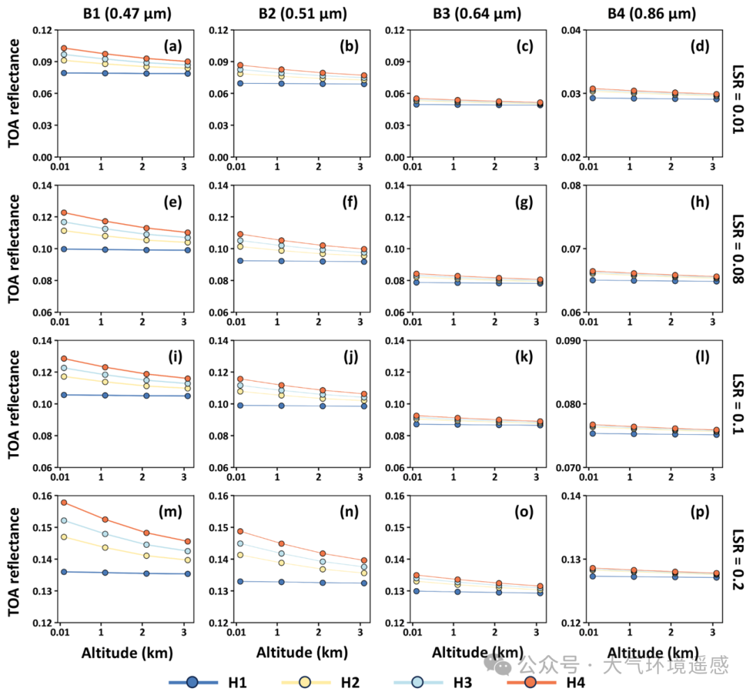 图2.气溶胶垂直分布对多光谱卫星观测信号的影响模拟