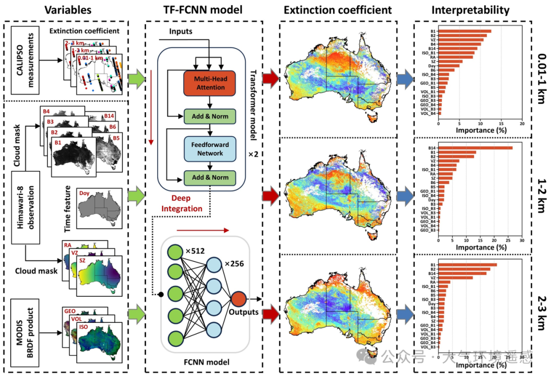 本研究提出了一种全新深度学习集成框架,将大语言模型结构(LLM)的 Transformer与全连接神经网络(FCNN)有效结合,用于融合主被动多源遥感观测及辅助数据,实现小时级、2 km分辨率的不同高度气溶胶消光系数(AEC)反演(图1)。在模型结构上,Transformer编码器作为局部特征提取器,能够有效捕捉输入数据的时空上下文与长距离依赖关系;随后,其输出被输入至多层 FCNN,以学习全局非线性映射关系,并最终预测三个高度层(0.01-1 km、1-2 km、2-3 km)的 AEC。在样本构建方面,本研究以CALIPSO激光雷达剖面作为“真值”标签,配对静止轨道卫星Himawari-8观测、极轨卫星MODIS地表BRDF双向反射信息及多源辅助数据,形成涵盖多种情景(如城市雾霾、野火等)的训练与测试数据集。在模型训练过程中,采用均方误差(MSE)作为主要损失函数,同时引入层间平滑正则化与早停策略以抑制过拟合,并结合Adam优化器与学习率衰减策略以提升训练效率与收敛速度。此外,我们构建了多层次的验证体系,对模型性能开展系统评估,包括基于样本、时间与空间的十折交叉验证,以及小时留一和行政区留一等多种交叉验证方法。为了增强模型的可解释性,研究进一步引入可解释人工智能,对输入特征的重要性进行定量评估,解析不同高度层预测结果的驱动因子,从而在保障预测精度的同时,提升对气溶胶垂直分布物理机制的理解。