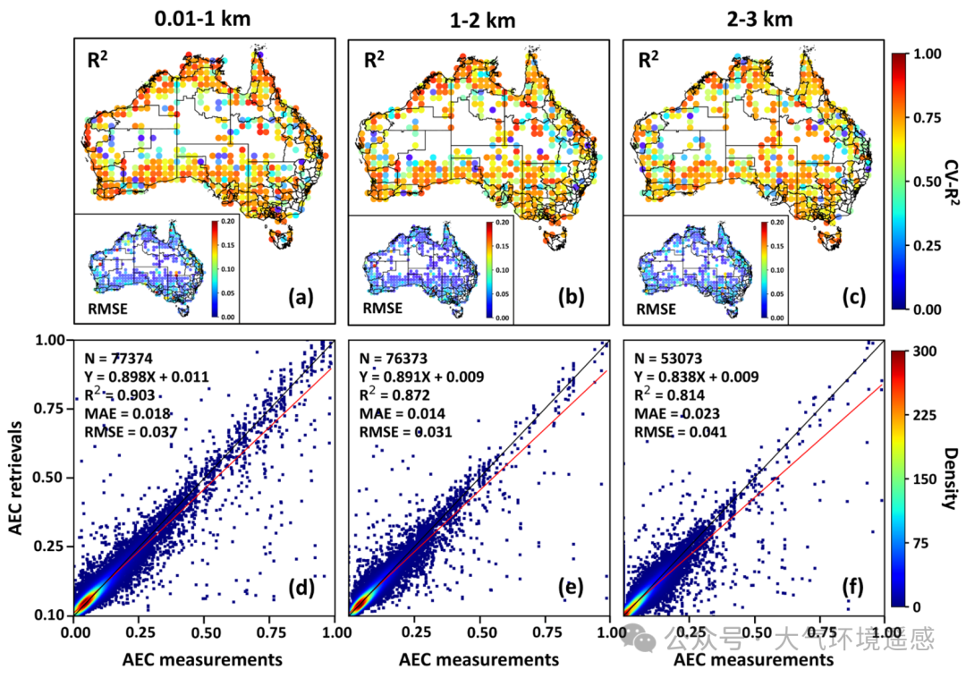 基于样本的十折交叉验证结果表明,我们的模型在澳大利亚不同气溶胶高度层(0.01–1 km、1–2 km、2–3 km)反演均表现优异,分别有62%、61%和62%的1°×1°网格样本在交叉验证中达到了较高的决定系数(CV-R² > 0.7)且均方根误差(RMSE)低于0.1。总体来看,0–1 km 层的气溶胶消光系数AEC反演结果与 CALIPSO 测量高度一致(CV-R² = 0.903,RMSE = 0.037);而在 1–2 km 和 2–3 km 层,反演精度略有下降(CV-R² = 0.87 和 0.81,RMSE = 0.031 和 0.041)。进一步的 1° 格网空间交叉验证显示模型具有较强的空间预测能力。在研究区中,不同高度层超过 60% 的格点均表现良好(CV-R² > 0.5 且 RMSE < 0.1),其中低层(0–1 km)预测效果最佳,平均 CV-R² 达 0.64;中层与高层预测精度相当(CV-R² 分别为 0.58 和 0.51)。基于年积日的时间交叉验证揭示了模型在时间维度上的稳健表现:约 60% 的格点在各高度层均满足 CV-R² > 0.5 且 RMSE < 0.1,总体 CV-R² 范围为 0.68–0.78。更独立的“留一小时”验证进一步表明模型在不同时段均能保持一致性(相关系数 R = 0.64–0.79,RMSE = 0.05–0.08),说明其时间泛化能力强且对昼间采样偏差不敏感。最后,留一区域验证结果显示,在不同行政区条件下,模型与 CALIPSO 观测仍保持中等至较高相关性(R = 0.41–0.77),且不确定性相对较低(RMSE = 0.07–0.15)。综上所述,多种验证实验一致表明,我们的模型在澳大利亚不同气溶胶高度层均具备稳健的空间与时间预测能力。