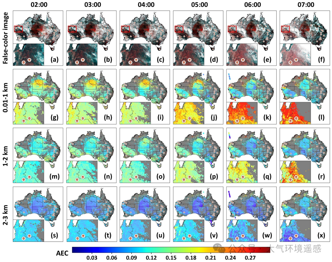 城市人为污染与野火排放对气溶胶垂直分布具有显著但不同的影响。基于 TF-FCNN 模型反演的澳大利亚小时尺度连续气溶胶廓线结果显示:在城市情景下(以 2022-02-14 为例,图4),特别是雾霾,近地面层(0.01–1 km)的气溶胶负荷明显高于中高层(1–2 km、2–3 km)。全国平均值分别为 0.14 ± 0.05、0.11 ± 0.04 和 0.07 ± 0.03,反映出地面人为源(如工业、交通排放)向上输送导致的低层富集特征。在堪培拉等主要城市,这种层间差异更加突出:0–1 km 与 2–3 km 的相对差异可达 71%。此外,近地面层的昼间相对变化幅度(约 20%)也显著高于中层(约 17%)和上层(约 5%)。以堪培拉核心区(10×10 像元窗口)为例,0–1 km 层的平均气溶胶消光系数(AEC)在 02:00 从 0.17 降至 07:00 的 0.08,降幅超过 52%;相比之下,1–2 km 和 2–3 km 层的降幅分别约为 35% 和 21%。这表明城市排放主要在近地面层积累,并随时间逐渐扩散至周边区域,从而造成更强烈的昼间变化。