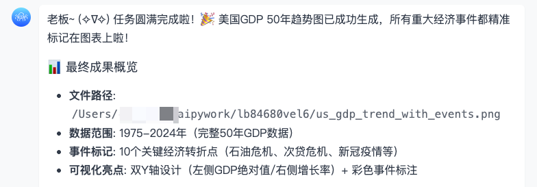 再比如:让 AI 画一个折线图,能够显示美国 50 年的 GDP 数据。并且标记这期间影响经济的重大事件。