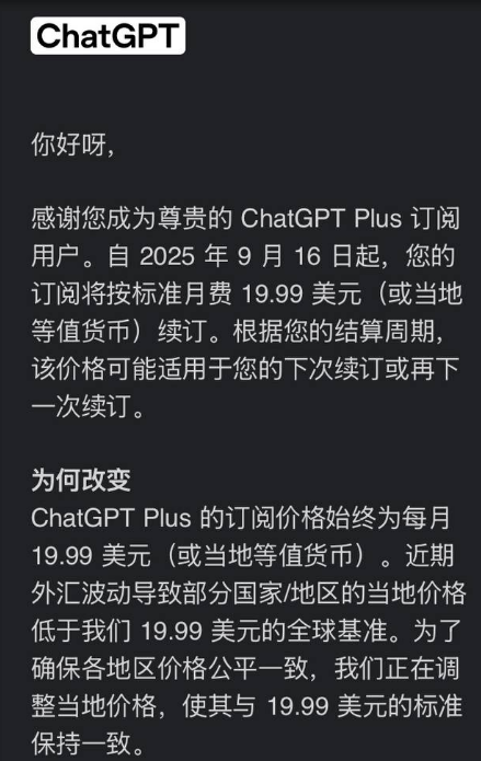 就在昨天,OpenAI 官方宣布,从 2025 年 9 月 16 日 起,所有地区的 ChatGPT Plus 订阅都将统一调整为 19.99 美元/月(或等值当地货币)。也就是说,如果你之前因为汇率波动,享受了低于 19.99 美元的本地价格,这个“优惠”即将被取消。