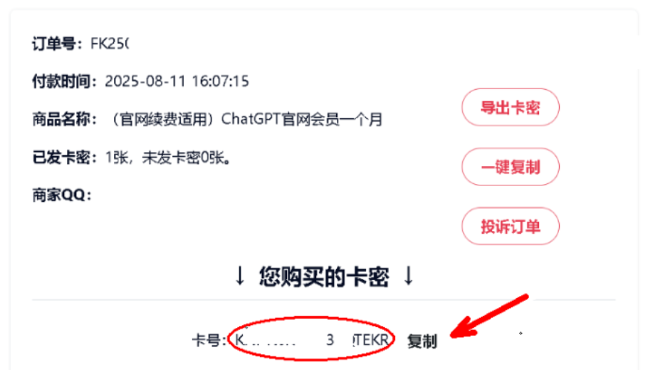 付款后,系统会进入“卡密复制页面”如下页面,点击复制,把卡密复制出备用
