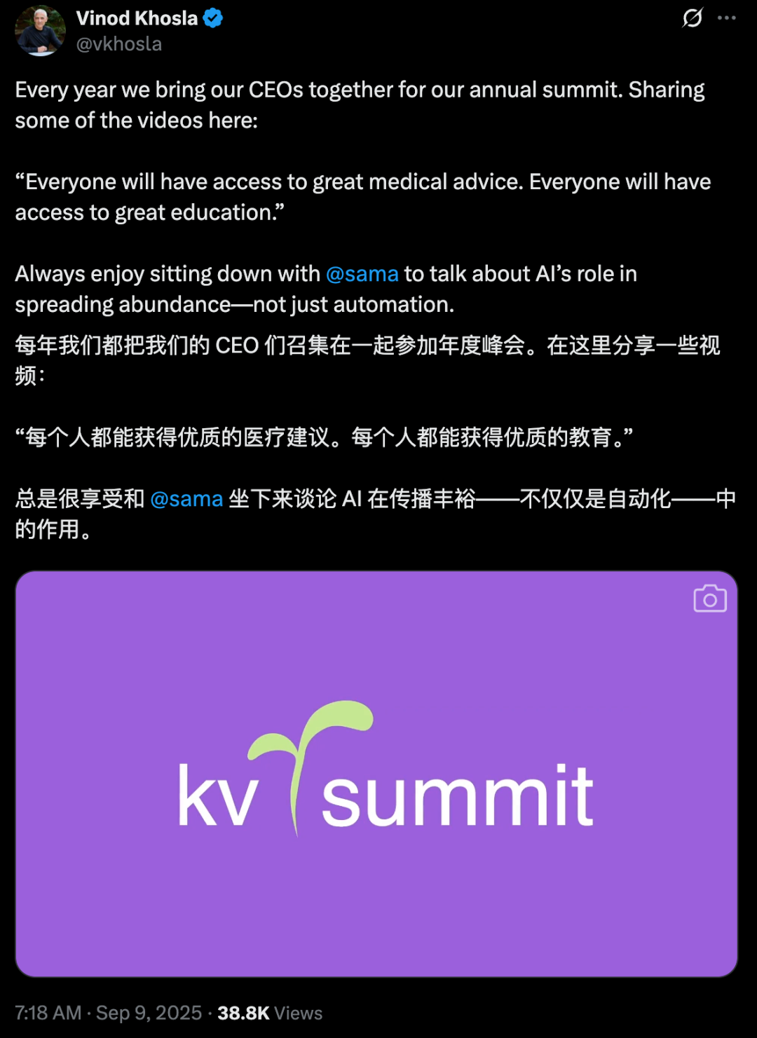 在今年五月,Khosla 举办的 CEO 峰会上,硅谷知名投资人 Vinod Khosla 和奥特曼,也聊到了类似的命题,