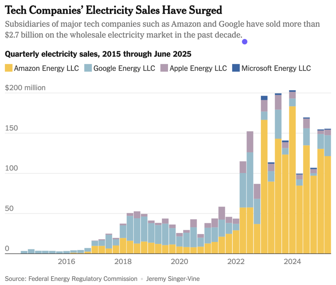 科技公司的电力销售激增,亚马逊和谷歌等大型科技公司的子公司在过去十年中在批发电力市场上的销售额已超过27亿美元。