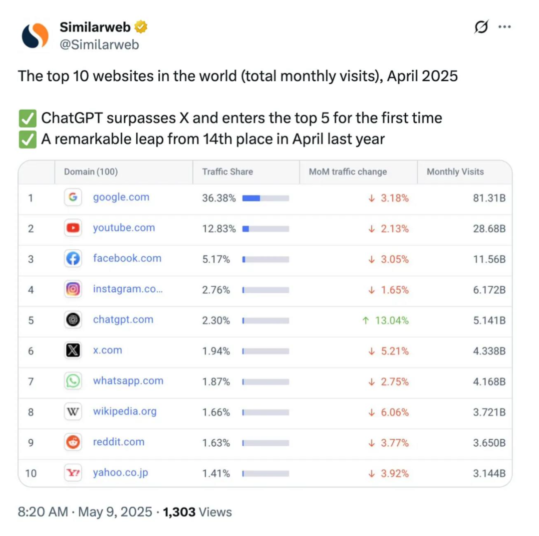 ChatGPT 现在应该是世界第五大网站了,如果它能保持当前发展,它会成为全球最大的网站。