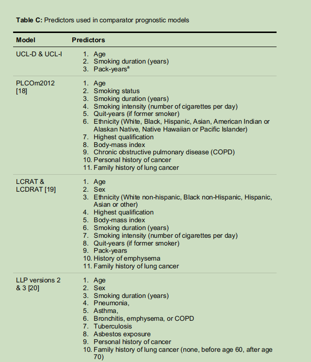 本研究也存在一些局限性:第一,研究采用回顾性数据,因此将模型用于前瞻性确定筛查资格时,研究结果可能存在差异。不过,PLCOm2012模型和利物浦肺癌项目(LLP)模型已在前瞻性研究中得到验证,证实了基于风险模型的筛查相比基于风险因素的筛查具有显著优势。通过与这些模型进行基准对比,我们有理由相信UCL模型在筛查项目中的性能可靠。第二,为验证模型的通用性,需在英美以外的数据集上进行进一步验证,这将是我们未来的研究方向。第三,本研究分析基于研究队列数据,而非能更好反映普通人群特征的常规电子健康记录数据。与本研究中作为基准对比的模型类似,由于电子健康记录中通常缺乏详细的吸烟数据[54],UCL模型在常规电子健康记录中的性能可能无法达到本研究中的水平。尽管如此,考虑到现有电子健康记录中预测变量存在缺失和编码不准确等已知问题[55],筛查项目不太可能依赖现有电子健康记录数据。第四,本研究开发的风险模型未纳入从不吸烟者。目前,尚无任何风险模型能够准确识别出从不吸烟者中符合现有肺癌筛查标准的高风险人群。