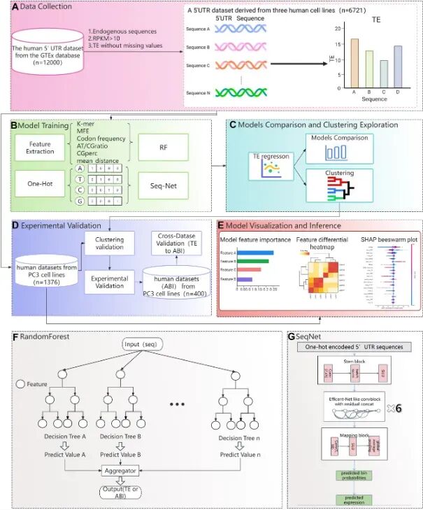 另一方面,精确量化 5′UTR 的方法需要成本高得多的文库。例如,对于 mRNA 疫苗,DNA 片段在体外转录,然后将得到的 mRNA 递送到人体内进行体内翻译。然而,一种复制此过程的有效方法需要在单个微管中分别测量每个 5′UTR,从而导致成本显著增加。在本研究中,作者通过开发计算和实验方法解决了预测 5′UTR 介导的 TE 的难题。为了克服手动 5′UTR 工程的局限性,作者根据 6721 个 5′UTR 序列构建了两个模型:一个结合序列和 RNA 二级结构特征的随机森林 (RF) 模型,以及一个利用序列特征预测 TE 的新型 SeqNet 模型。认识到在大型数据集上训练这些模型的资源密集型特性,作者进一步开发了一种创新的序列聚类策略,该策略显着减少了所需的训练数据集大小,同时保持了预测准确性。最后,使用基于萤火虫荧光素酶表达的小型文库来验证该方法可以比 TE 值更准确地反映 mRNA 治疗中实际的蛋白质表达水平。该方法紧密模拟了 mRNA 疫苗的功能过程,从而能够精确量化蛋白质产量。作者的综合方法的有效性已通过 PC3 细胞系中的概念验证实验得到验证,这证明了作者模型的预测能力和实验系统的可靠性。这种结合先进的机器学习技术与高保真实验验证的策略不仅可以推动 5′UTR 优化领域的发展,还可以提供可适应分子生物学其他领域的框架。图1研究流程图。(图源自Nucleic Acids Research)https://academic.oup.com/nar/article/53/17/gkaf861/8249852内容为【iNature】公众号原创,