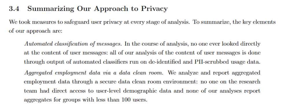 和以往基于问卷调查的方式不同,这一次研究团队主要基于内部对话数据,采用自动化分类器并结合隐私保护方法来分析ChatGPT的实际使用情况,可以说更科学合理了。