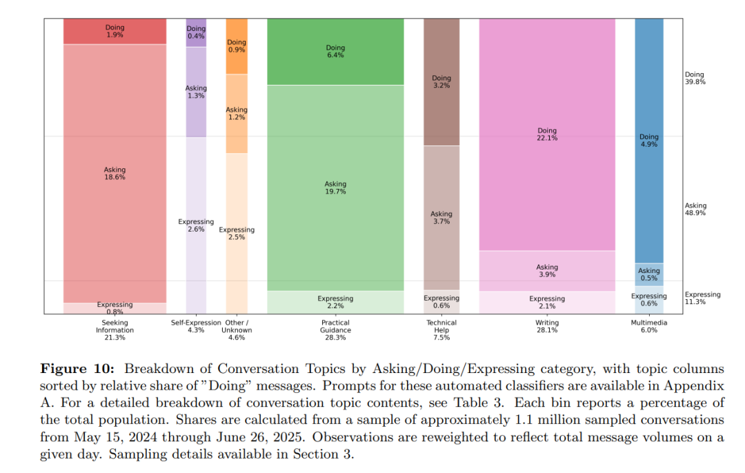 2、分类消息样本:2024年5月~2025年6月随机抽取约110万条去标识化消息,用LLM分类器标注用途、主题、交互类型。