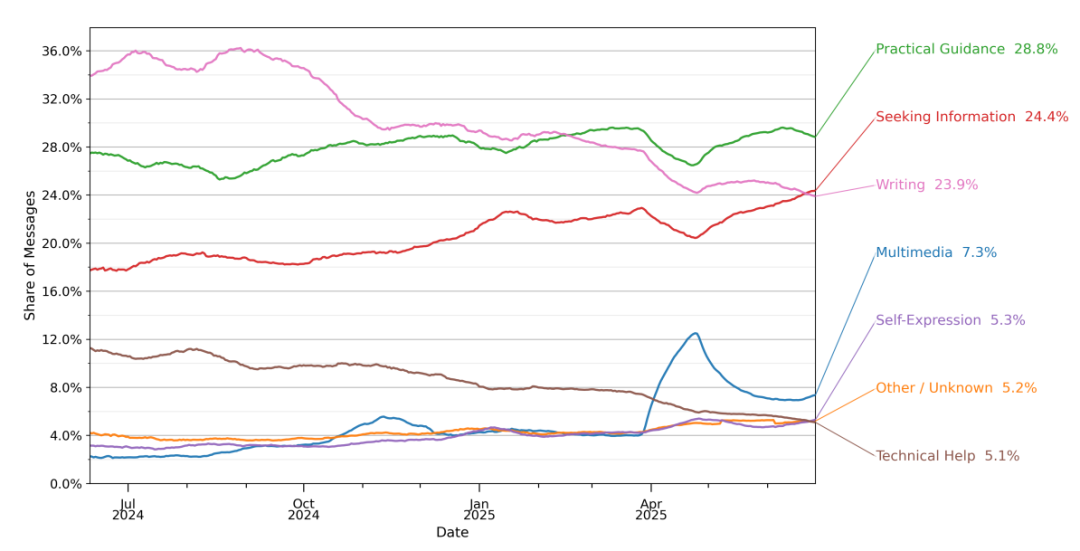 四分之三的对话侧重于实用指导、信息搜索和写作。其中写作是最常见的工作任务,而编程和自我表达仍然是小众活动。