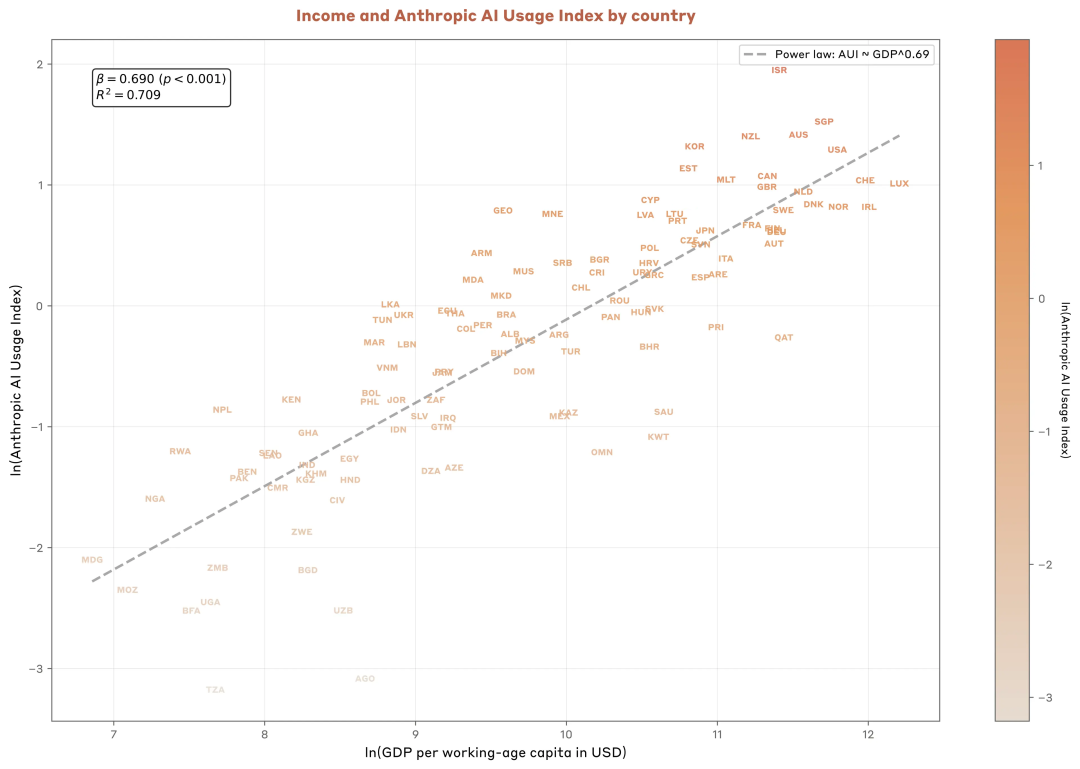 这在很大程度上可以用收入水平来解释:人均GDP与Anthropic AI使用指数之间存在很强的正相关性(人均GDP每高1%,AUI相应高出0.7%)。
