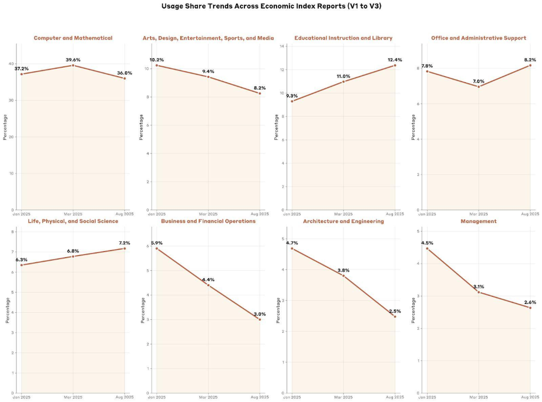 自2024年12月以来,计算机和数学相关的任务就占据了主导地位,约占对话的37-40%。