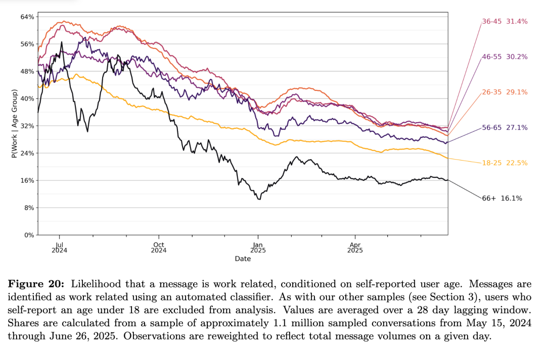 总言之,所有年龄段的用户对ChatGPT的使用,均呈现出工作相关用途逐渐减少的演变特征。