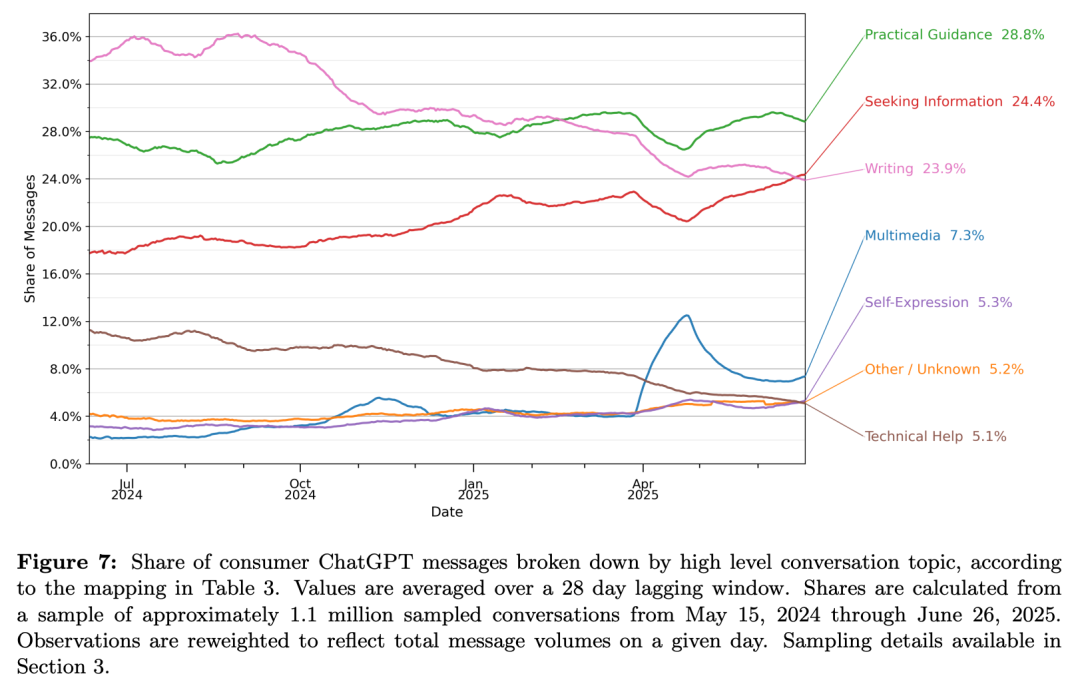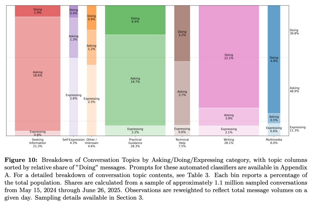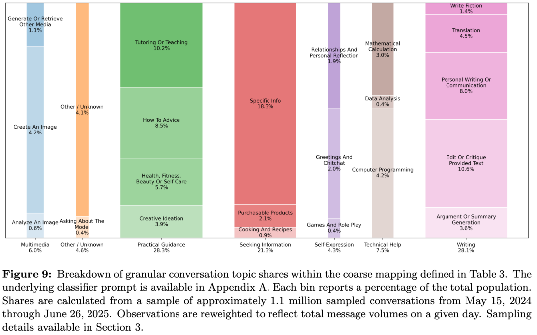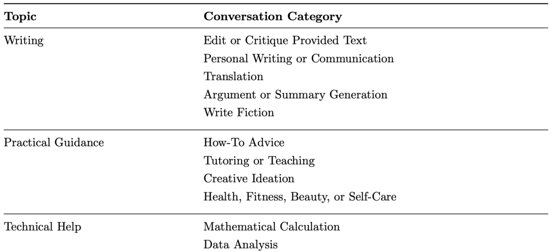其中,实用建议、信息查询、文书写作,是最常见的三大主题,占对话80%。