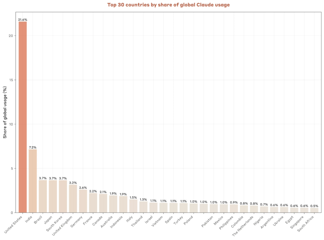毫无疑问,美国是Claude的头号粉丝,使用量遥遥领先。