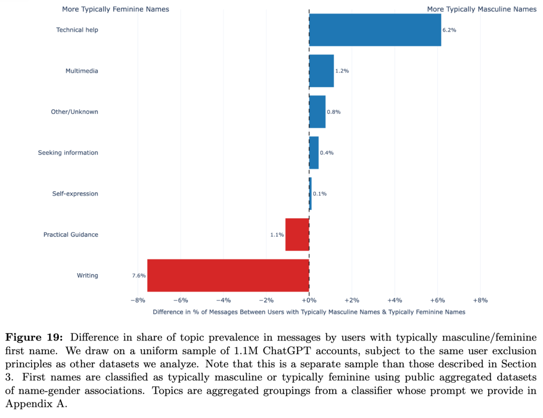女性ChatGPT用户,更倾向于写作、实用指导相关的任务;男性用户则更频繁地获取技术帮助、信息查询、多媒体服务。
