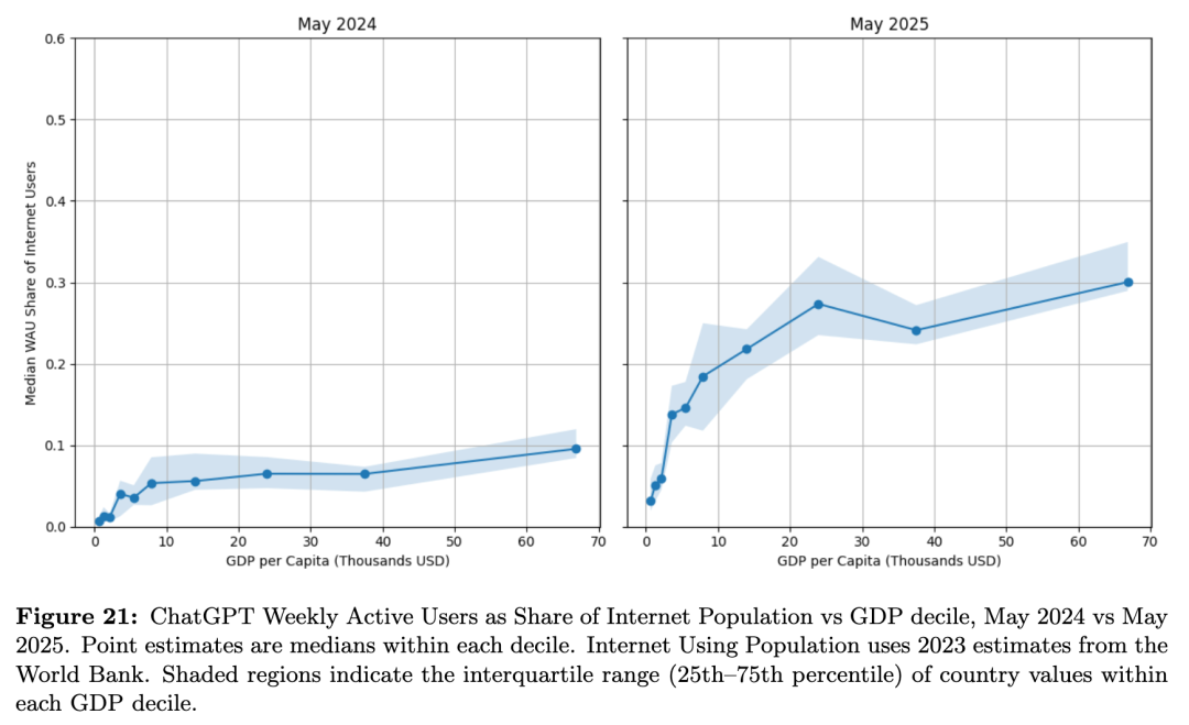 在中低收入地区(人均GDP介于1万至4万美元之间)中,ChatGPT使用率迅速增长。