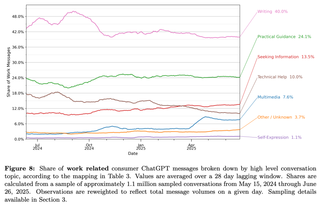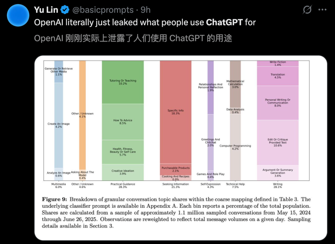 有趣的是,技术类问题,比如编程使用比例,从12%骤降至5%。OpenAI分析称,很多开发者直接调用API、其他AI工具写代码,比如Codex。