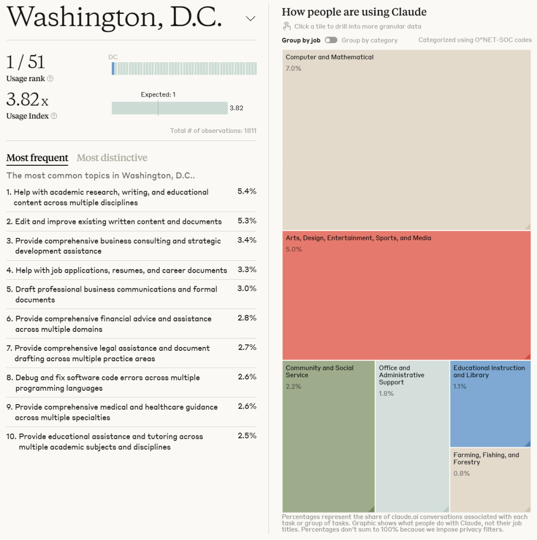 全美AUI指数最高的地区是哥伦比亚特区(3.82),在这里,人们最爱让Claude做的,是编辑文档、搜索信息这类典型的「白领」工作。