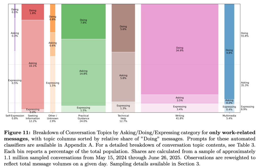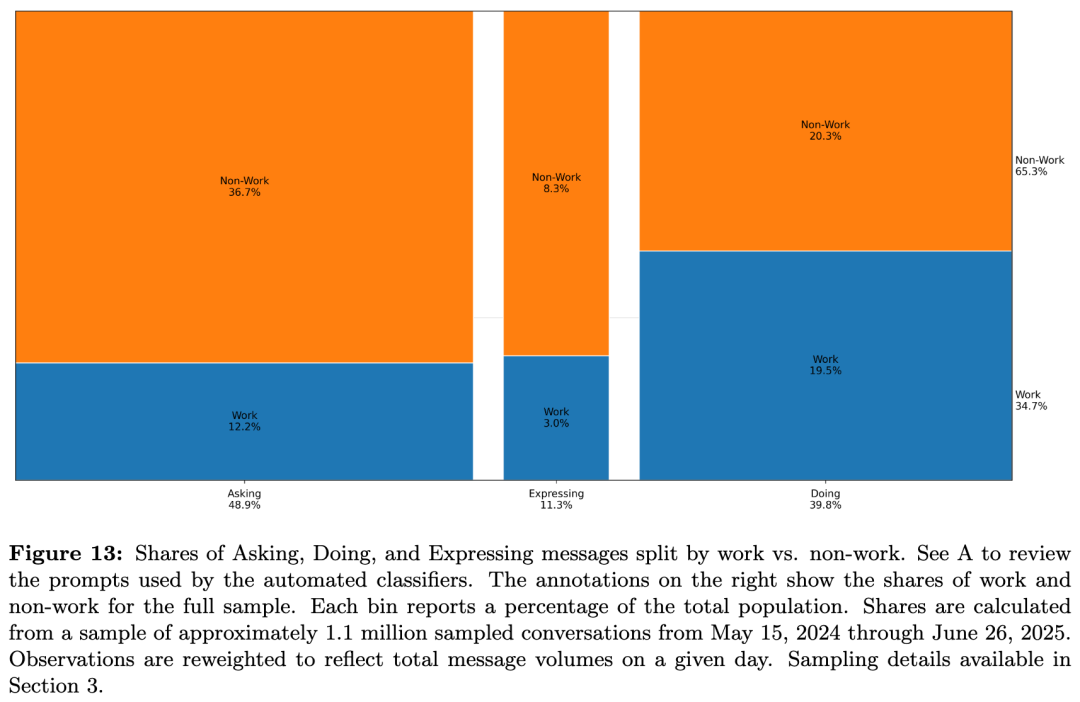 下图中,是110万条抽样对话,提问、执行和表达使用情况,在工作非工作类中的占比。