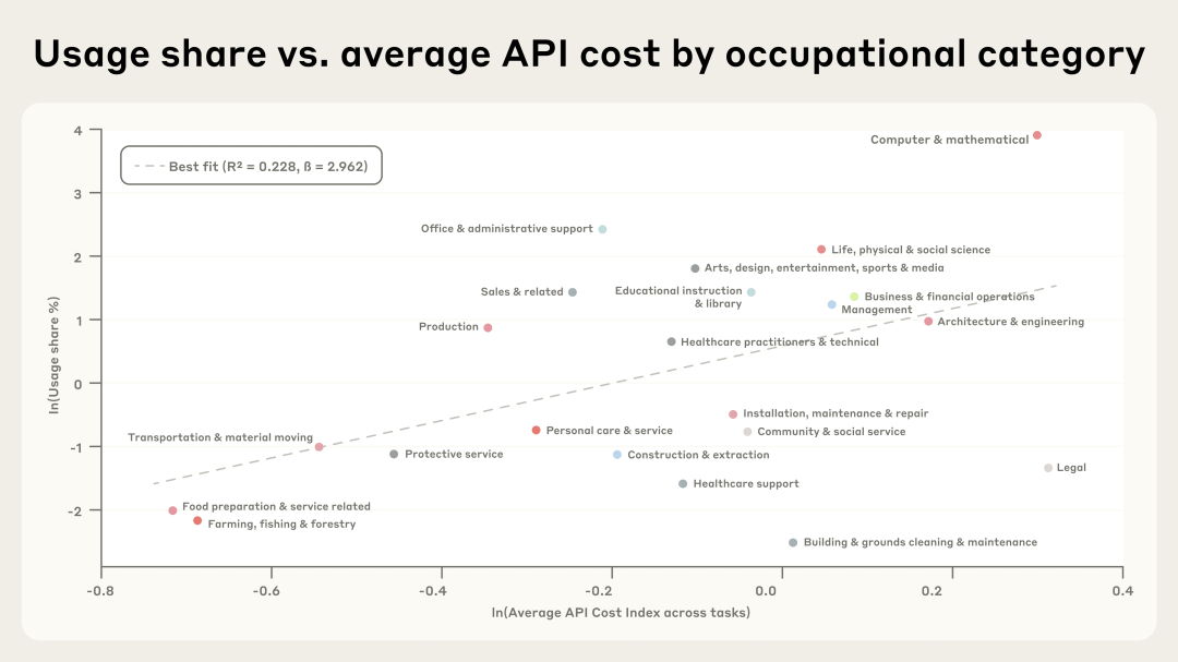 报告发现,成本越高的任务类别(通常意味着更复杂、更有价值),企业反而用得越多!