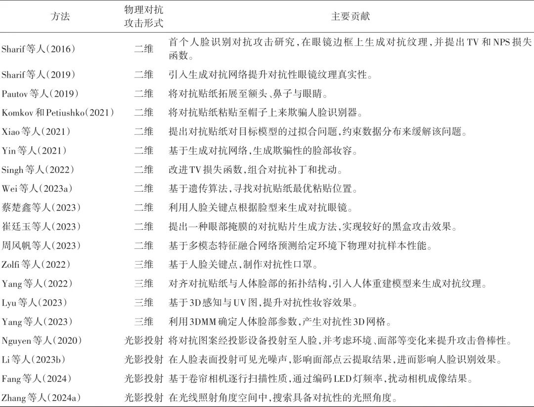 表 2 针对人脸识别的物理对抗攻击方法描述