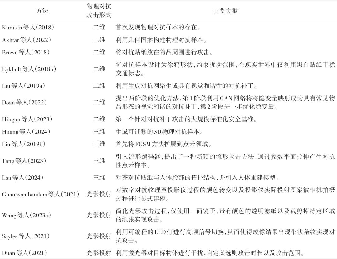 2.论文按照物理对抗攻击的常见形态与应用场景对相关研究进行分类和总结,并对物理对抗攻击所面临的两大核心问题:“现实偏差问题”与“高自由度观测问题”进行分析与关键技术总结。