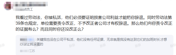 有人评论说,你接私活,公司必须证明损害了公司利益才能把你辞退,况且公司没有证据证明你接私活。