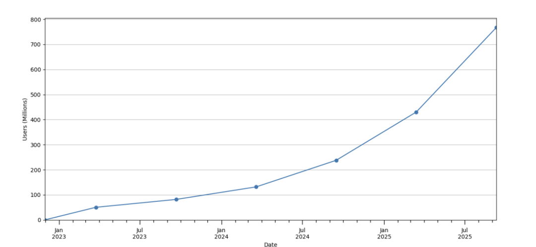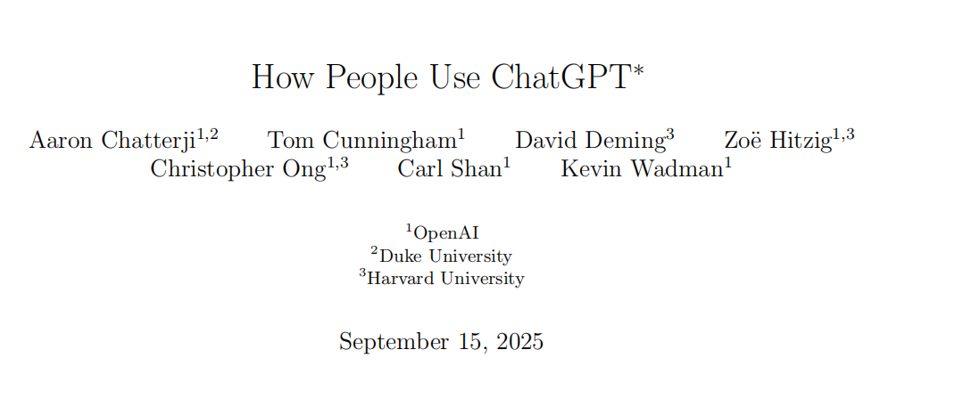 近日,OpenAI与杜克大学、哈佛大学的研究团队共同发布了一份长达63页的研究成果,题为《人们如何使用ChatGPT》。这是第一份基于内部对话数据的系统分析,揭示了ChatGPT自2022年底发布以来的真实使用方式。报告显示,ChatGPT自2022年11月上线至2025年7月,已经拥有超过7亿周活跃用户,约占全球成年人口的10%。这种扩散速度在科技史上没有先例,比互联网和智能手机的普及更为迅猛。图注:消费者方案(免费版、Plus、Pro)的 ChatGPT 每周活跃用户数,以每六个月为一个时间点快照展示,涵盖 2022 年 11 月至 2025 年 9 月。与此同时,消息发送量也在飙升。2024年6月,用户每天共发送4.5亿条消息;一年后,这一数字达到26亿条,相当于平均每秒发送2.9万条消息。来自 ChatGPT 消费者方案(免费版、Plus、Pro)的每日消息量,按用户注册日期分组。用户结构也在快速演变。最初八成用户是男性,但到2025年中,女性用户比例已反超男性,性别差距几乎消失。