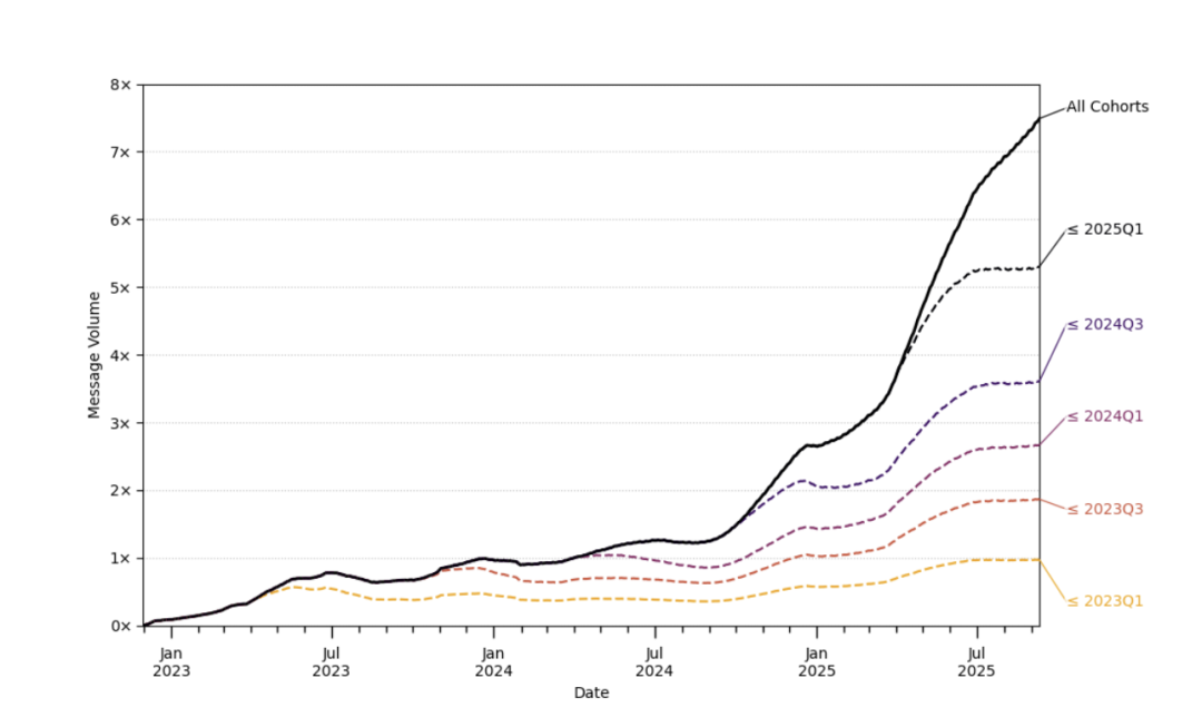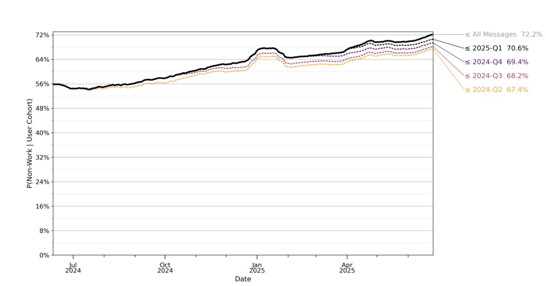 随着时间推移,用户发送的消息中非工作相关内容的比例逐渐上升,到 2025 年中约占七成以上。
