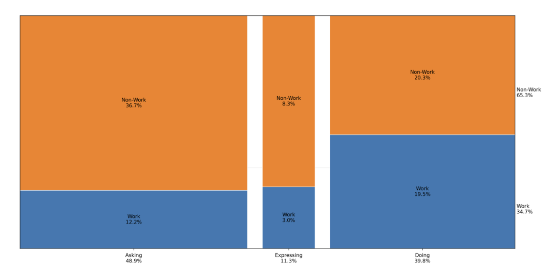 研究团队进一步从用户意图切入,将消息分为“询问、执行、表达”三类。结果显示,49%的消息属于询问,40%属于执行,只有11%属于表达。