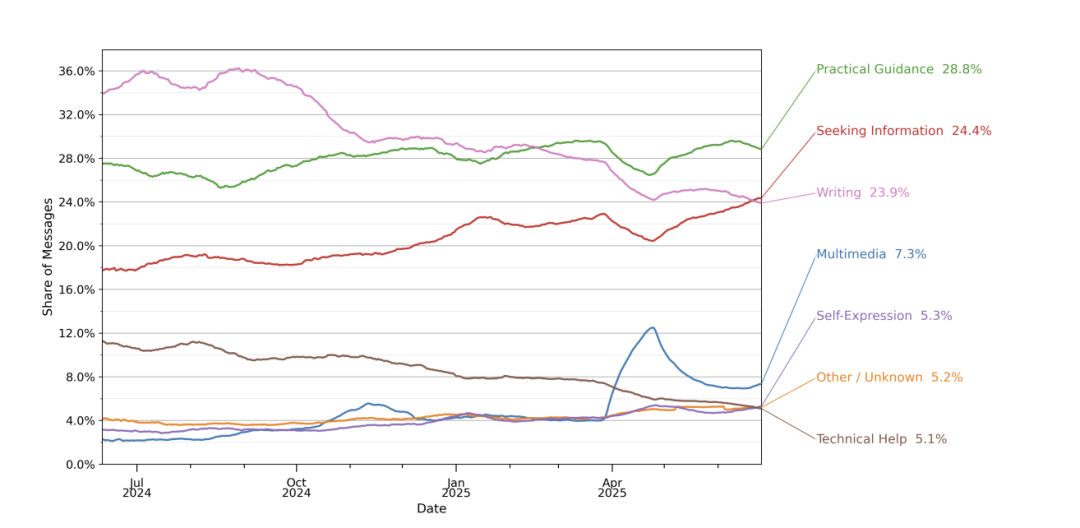 与公众印象不同,编程需求占比很小,仅为4.2%的消息。至于外界热议的“AI陪伴”,比例更低,仅有2.4%的消息涉及个人关系或角色扮演。