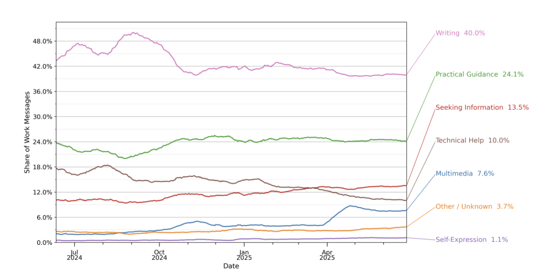 在工作场景里,写作是最突出需求。40%的工作相关消息与写作有关,其中三分之二涉及修改用户提供的文本,而非从零生成新内容。这表明ChatGPT更多充当“润色助手”和“语言顾问”,而不是完全替代原创。