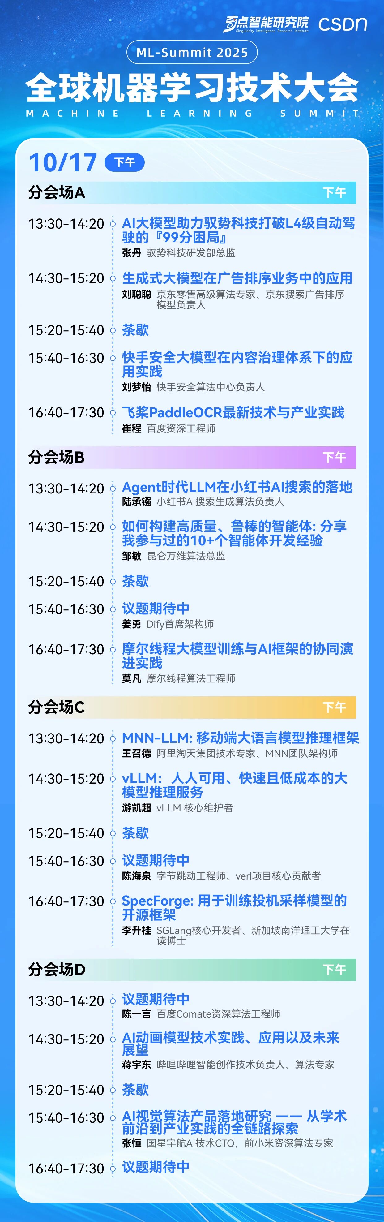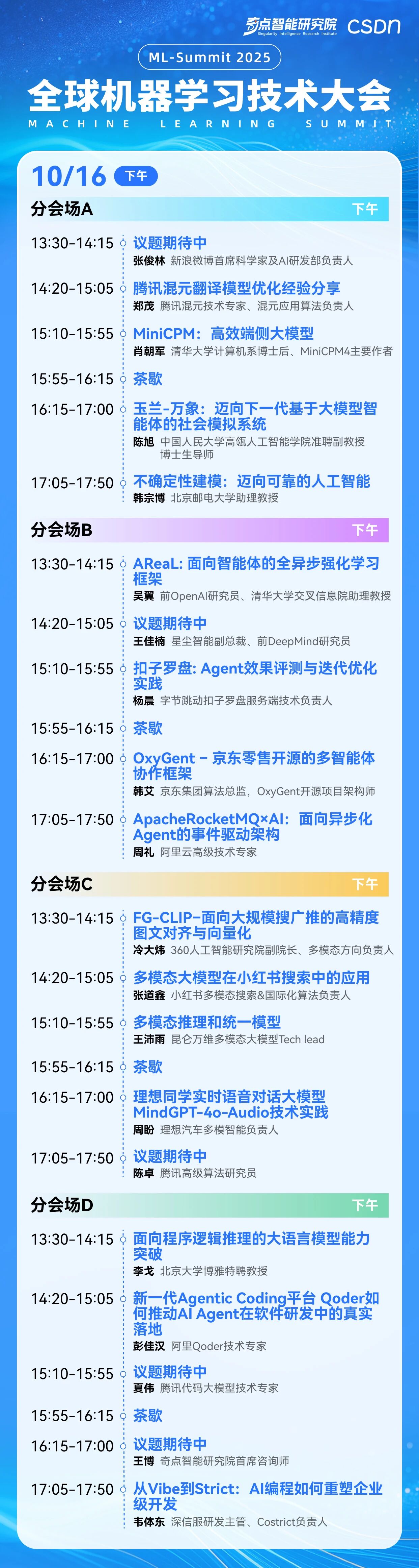 正是在这种历史周期的加速交替与范式转换背景下,由 CSDN 与奇点智能研究院联合举办的 2025 全球机器学习技术大会将于 10 月 16–17 日在北京威斯汀酒店召开,届时全球顶级学者与产业领袖将齐聚一堂。在这里,我们将不再仅仅停留在对未来的想象,而是与 50 余位顶尖专家一道,深度剖析这些核心命题,共同探索 AI 时代的无限可能。