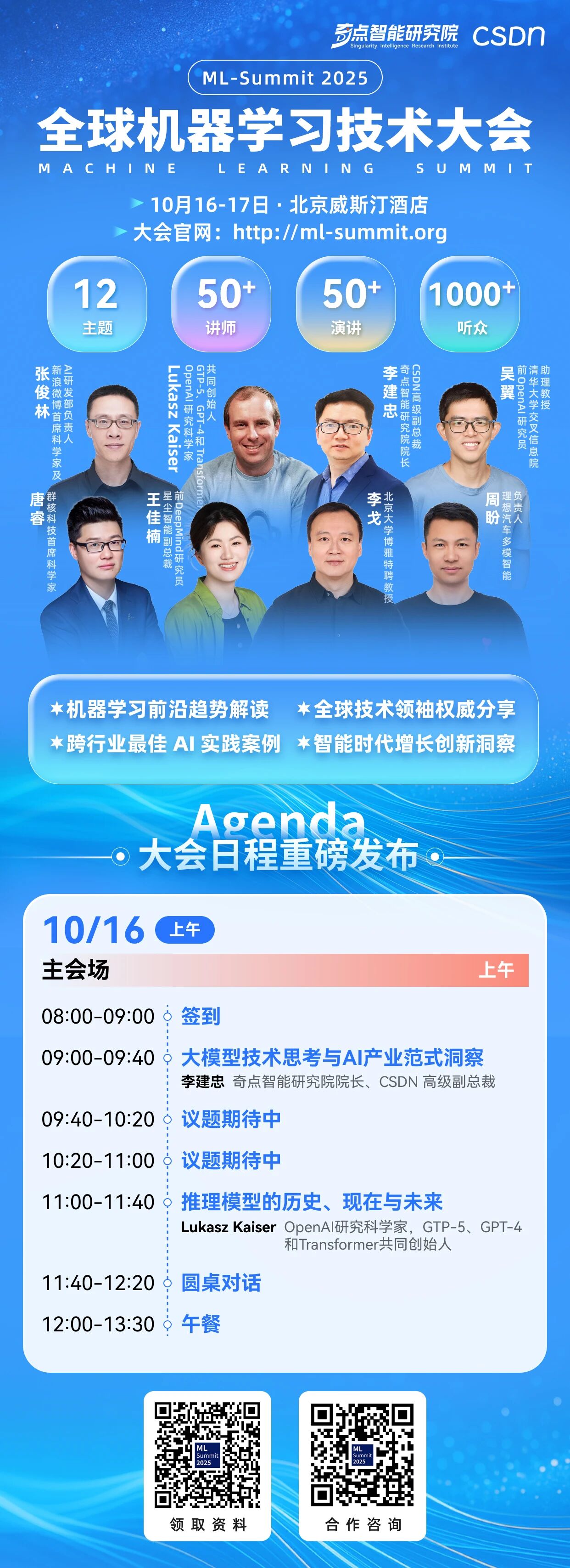 加入 OpenAI 之后,Lukasz 成为 GPT-5、GPT-4、o1、o3、ChatGPT 等一系列前沿模型的核心共同发明人,推动了大模型从预训练模型向推理模型的范式转换。Transformer 共同发明人 Lukasz Kaiser作为现任 OpenAI 资深研究科学家,他将最前沿的理论与实践紧密结合。在本次大会主会上,Lukasz Kaiser 将以《推理模型的历史、现在与未来》 为主题,带领大家回顾推理模型的发展轨迹,剖析当前的技术进展,并展望未来的可能路径。他将结合自身的研究与实践,带来对大模型发展与未来计算范式的最新思考,为整个大会奠定技术与思想的前沿基调。与此同时,奇点智能研究院院长、CSDN 高级副总裁李建忠将带来《大模型技术思考与 AI 产业范式洞察》的主题演讲。他长期致力于推动 AI 基础研究与产业落地的双向融合,为研究与产业之间架起桥梁。李建忠将深入剖析大模型对计算、开发和交互范式的重塑,解读智能体平台、操作系统及互联网生态的未来发展。他的分享将为大会提供战略与技术的全景视角,助力与会者洞察 AI 时代的无限可能。此外,大会上午场还将邀请多位行业领军者深度探讨大模型技术的最新发展与商业化挑战,为 AI 未来的演进提供前瞻视角。