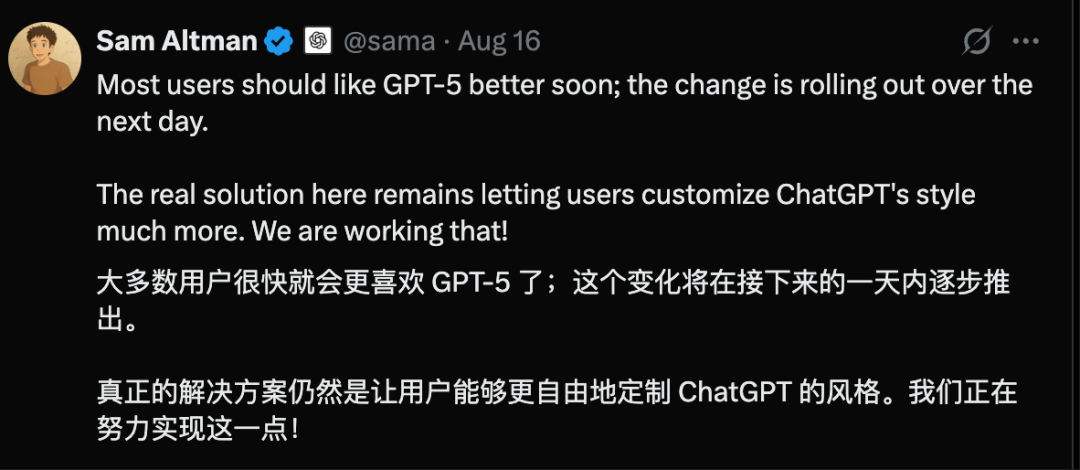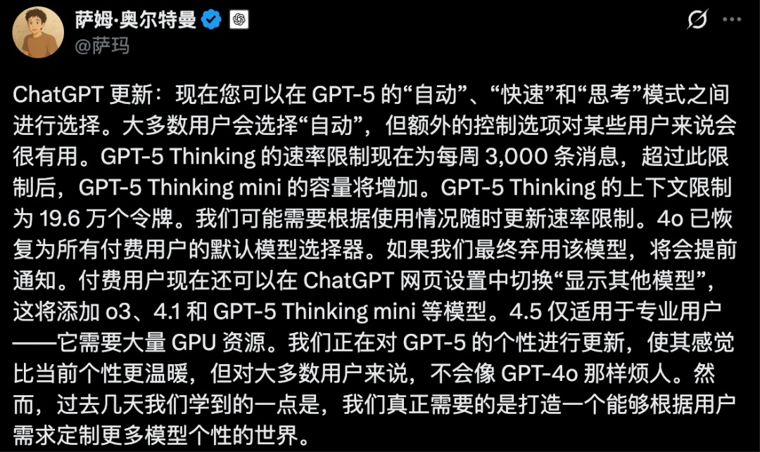 一是将原有模型重新提供给ChatGPT付费用户;二是对GPT-5的个性进行更新,上线了「选择你自己的性格」的能力。