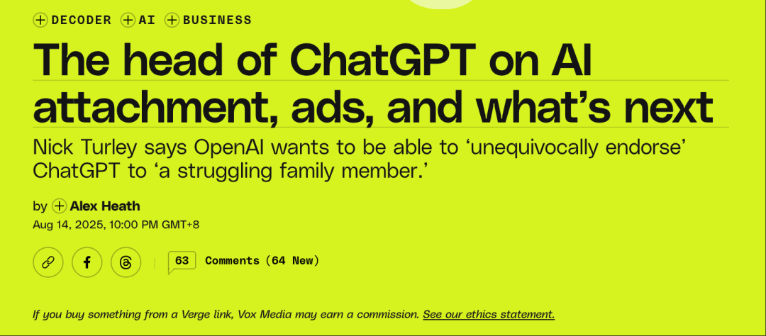 一周之后,Nick Turley在《The Verge》编辑Alex Heath的采访中,深度复盘了GPT-5发布后面临的用户差评风波,以及他的一些思考。