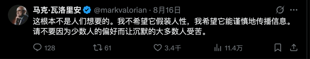 比如就在8月16日,OpenAI宣布会让GPT-5由以前的过于正式,变为更加温暖和友好时,也有网友反对让GPT-5过度人格化。