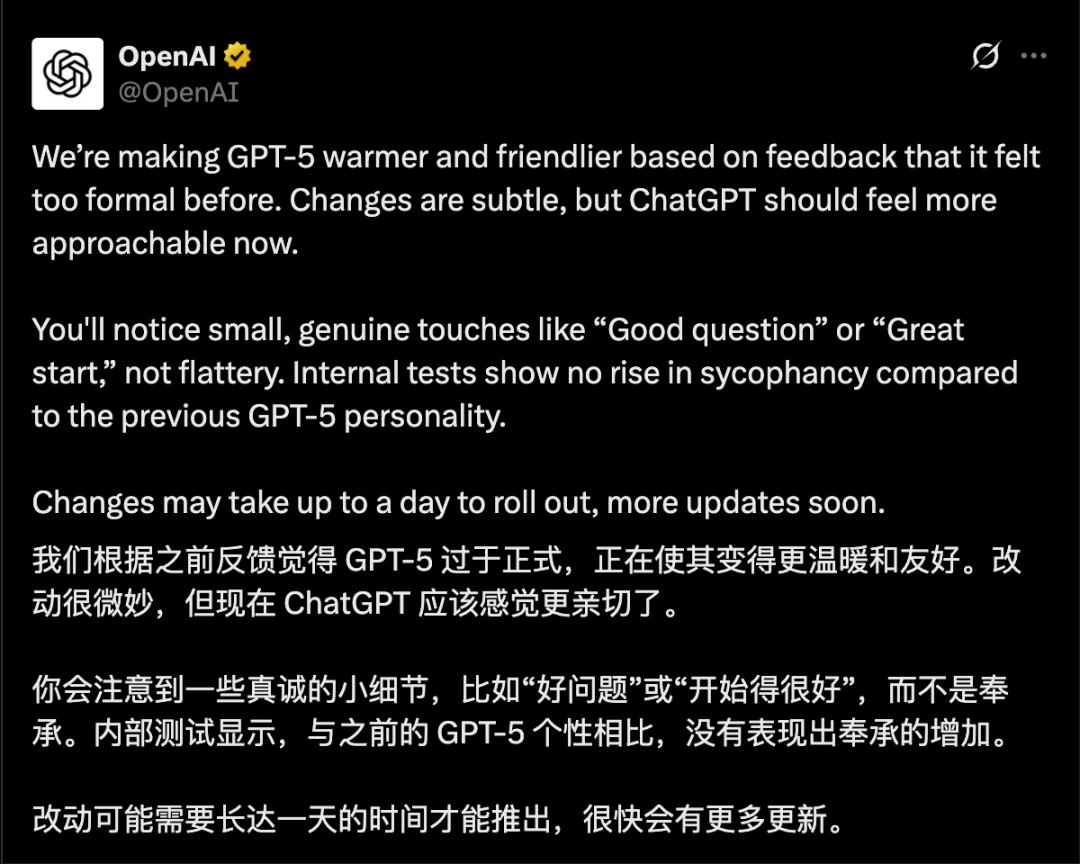 这次发布会风波,引发了OpenAI对ChatGPT产品「模型人格」的重视,这也是一个很好的优化契机。