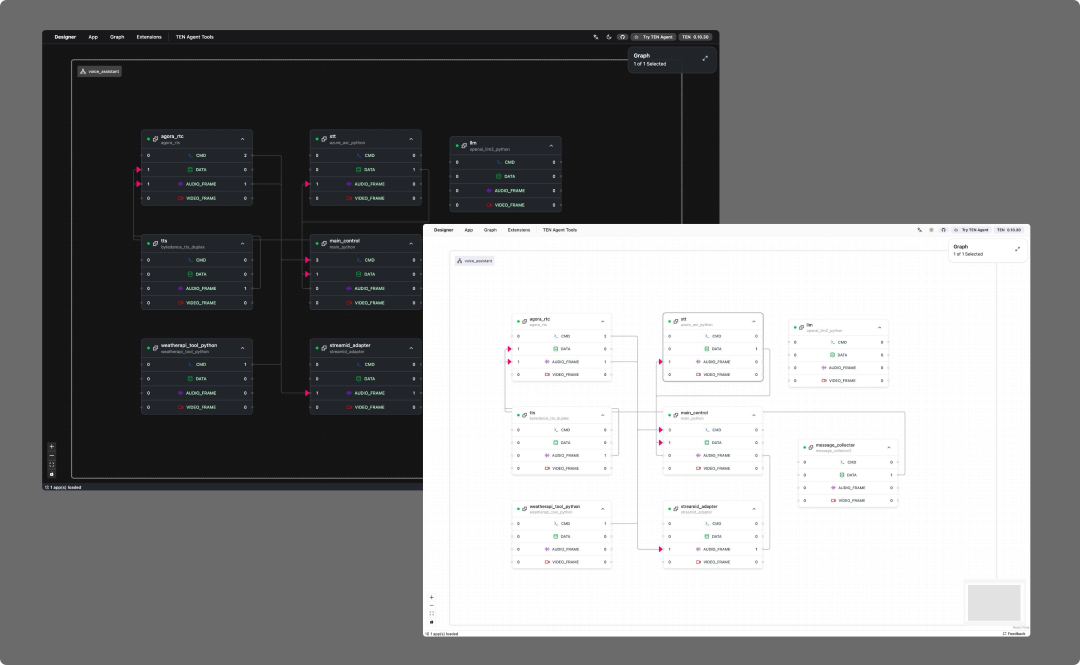为了适配各种不同使用场景,TEN 支持包括 Deepseek、OpenAI、Gemini 等全球各大主流 STT、LLM、TTS 厂商。更重要的是,TEN 支持开发者主动接入自己想要的各种模型,bring your own models。开发者在使用过程中,可随时任意切换。